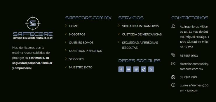 Safecore es una empresa mexicana de seguridad privada dedicada a proteger el patrimonio y la integridad personal, familiar y empresarial de nuestros clientes. Cumplimos nuestra labor con profesionalismo, prudencia y alto sentido de responsabilidad. Contamos con personal capacitado, equipo actualizado y protocolos que garantizan la continuidad operativa ante cualquier riesgo. Estamos ubicados en Av. Ingenieros Militares 111, Lomas de Sotelo, Miguel Hidalgo, CDMX. Permiso Federal Permanente: DGSP/466-24/5243 REPSE: STPS/UTD/DGIFT/AR189577/2025 En Safecore, su seguridad es nuestra misión.